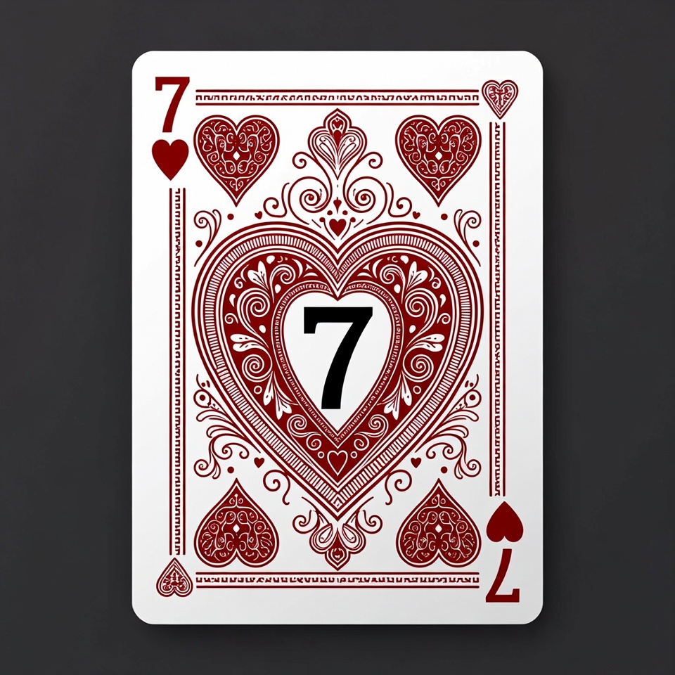 A card shows the number seven in the center with a heart symbol. The card has decorative patterns and a red and white color scheme.