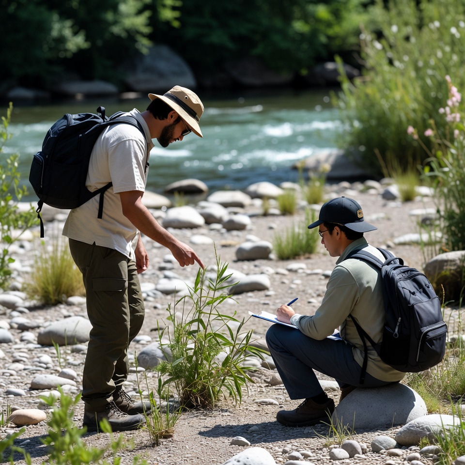 Two people are examining plants near a riverbank. One is standing and pointing, while the other is taking notes on a notepad.