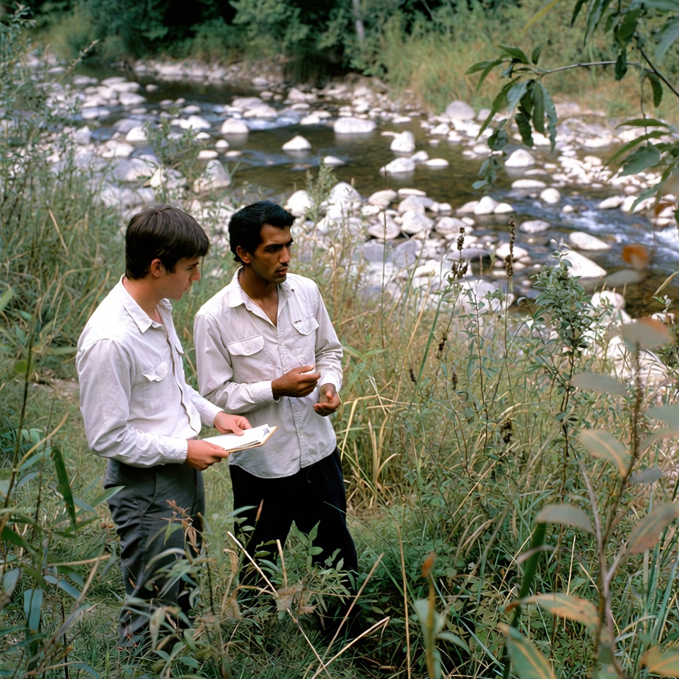 Two men stand near a river, observing and recording plants. They focus on the greenery around them while nature surrounds them.