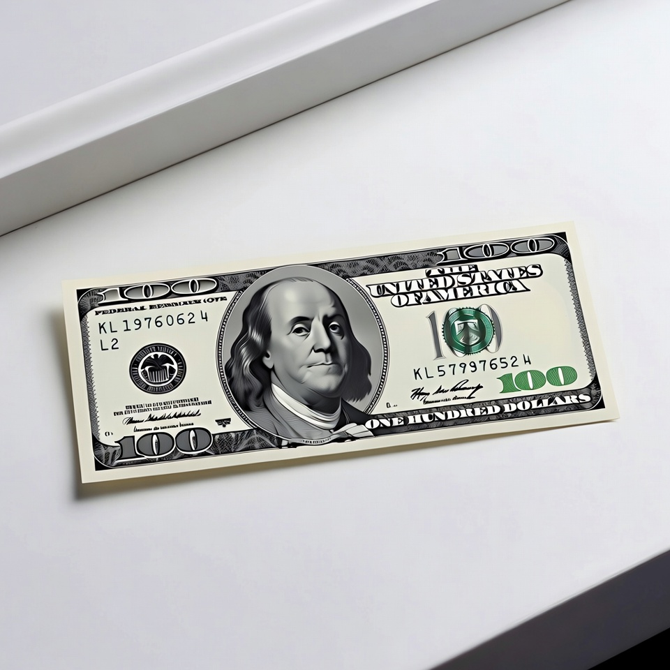 A one hundred dollar bill is placed on a flat white surface. The bill shows the portrait of Benjamin Franklin and security features.