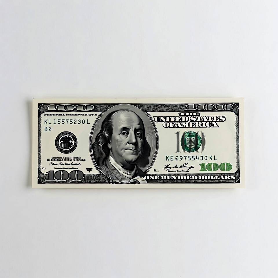 A hundred dollar bill is laid flat on a white surface, showing the detailed design and portrait of Benjamin Franklin clearly.