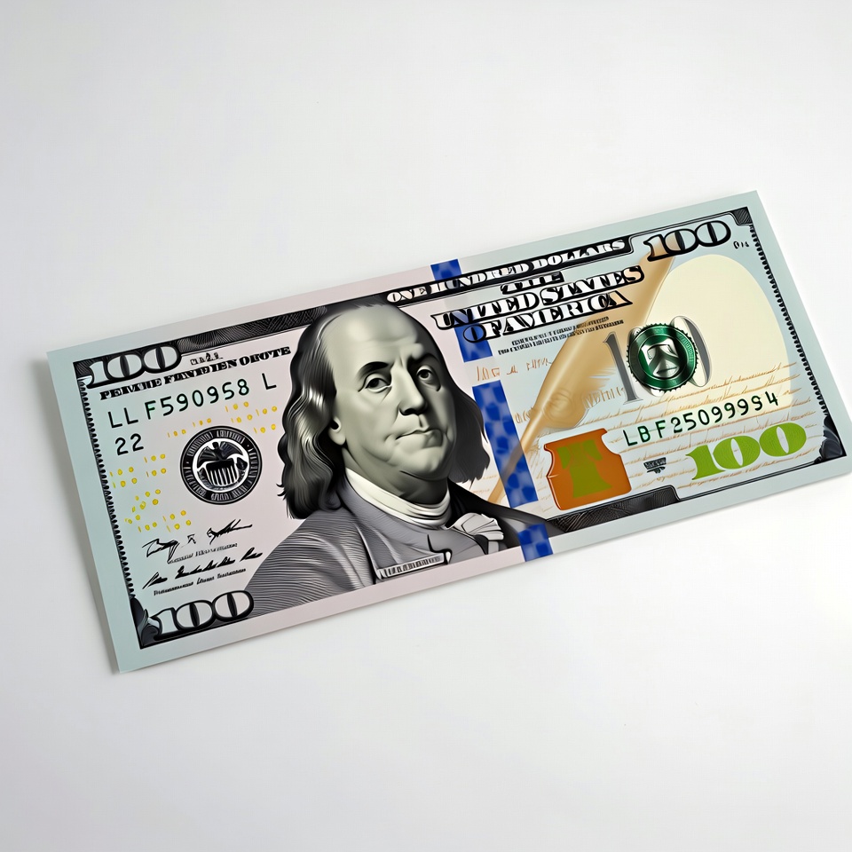 A hundred dollar bill is displayed on a white surface. The bill features a portrait of Benjamin Franklin and security features.