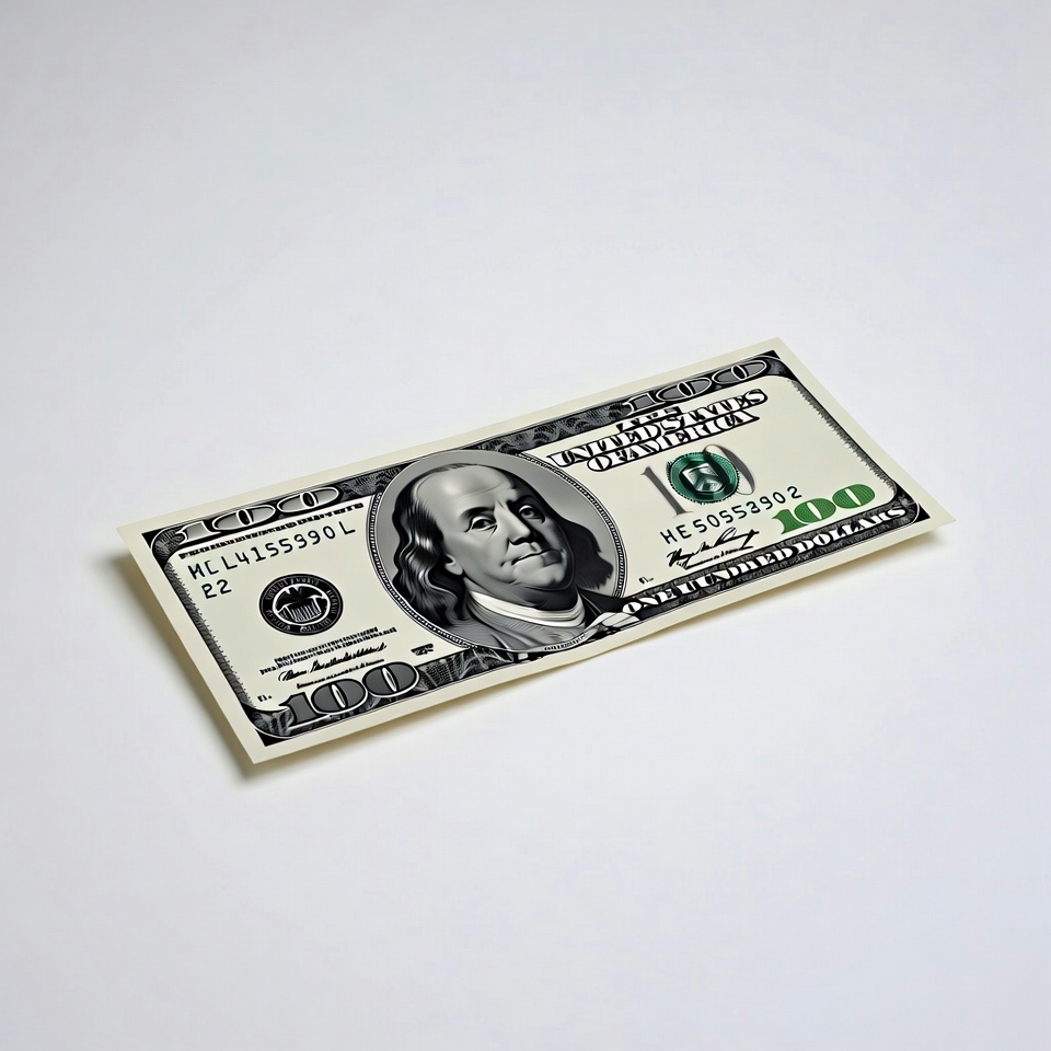 A one hundred dollar bill rests on a plain white background. The bill displays the image of a notable historical figure.