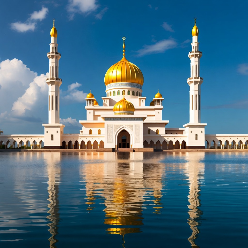 A large mosque with a golden dome is seen beside a body of water. The sky is blue with white clouds and the mosque features tall minarets.