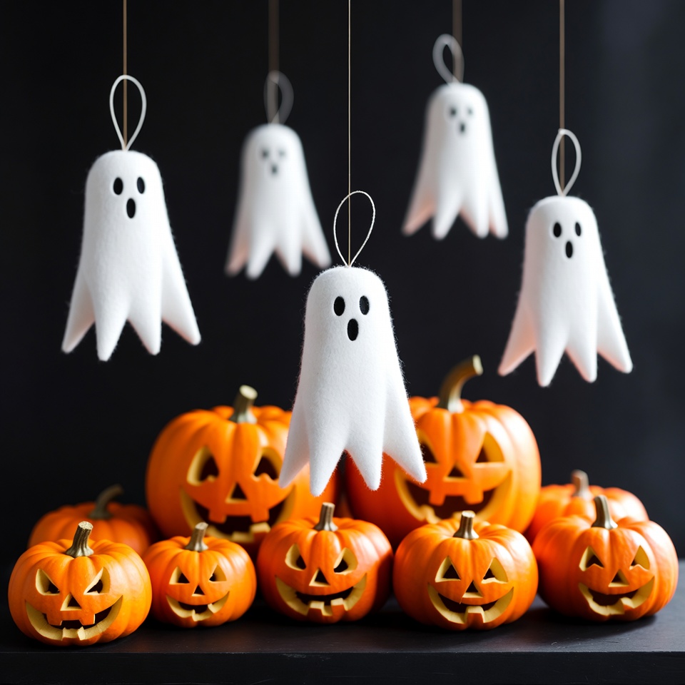 White ghosts hang above carved pumpkins in a simple Halloween setup. The scene shows the festive spirit of the holiday celebration.