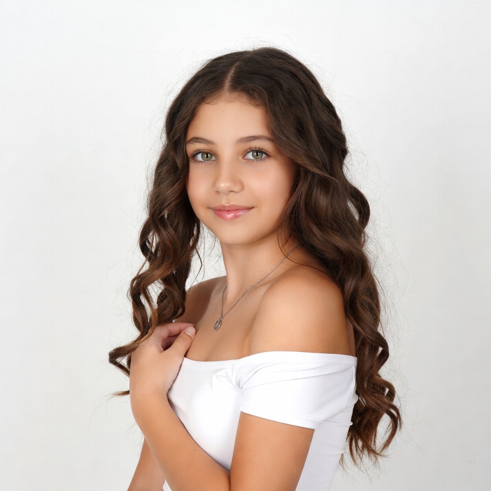 A girl stands smiling with curly hair in a white top. She poses against a plain white background. Her expression is joyful and inviting.
