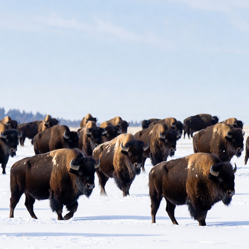 A herd of bison moves across a snowy field under a clear sky. The animals appear in a group, showing their strength and resilience.