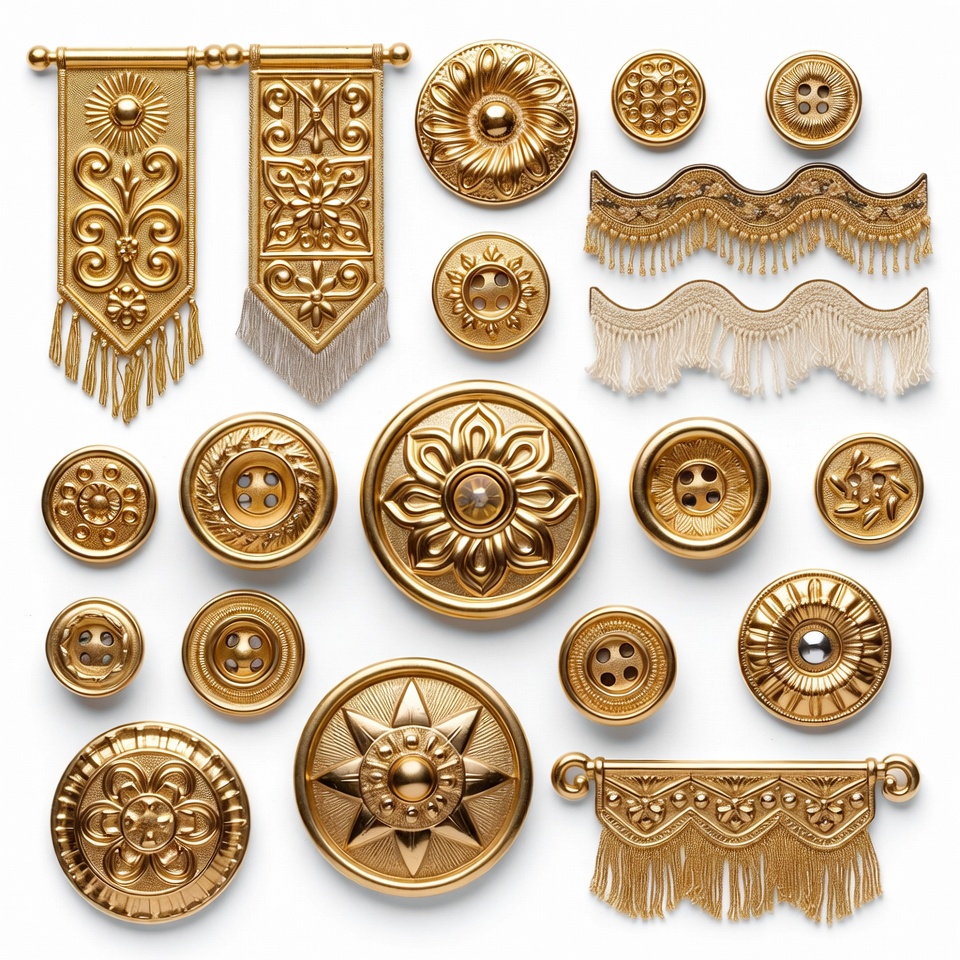 antique style, banners, buttons, circular shapes, craft supplies, decorative items, design elements, embellishments, fashion accessories, floral designs, gold decorations, handmade items, home decor, intricate designs, ornamentation, patterns, sewing, shapes, tassels, texture