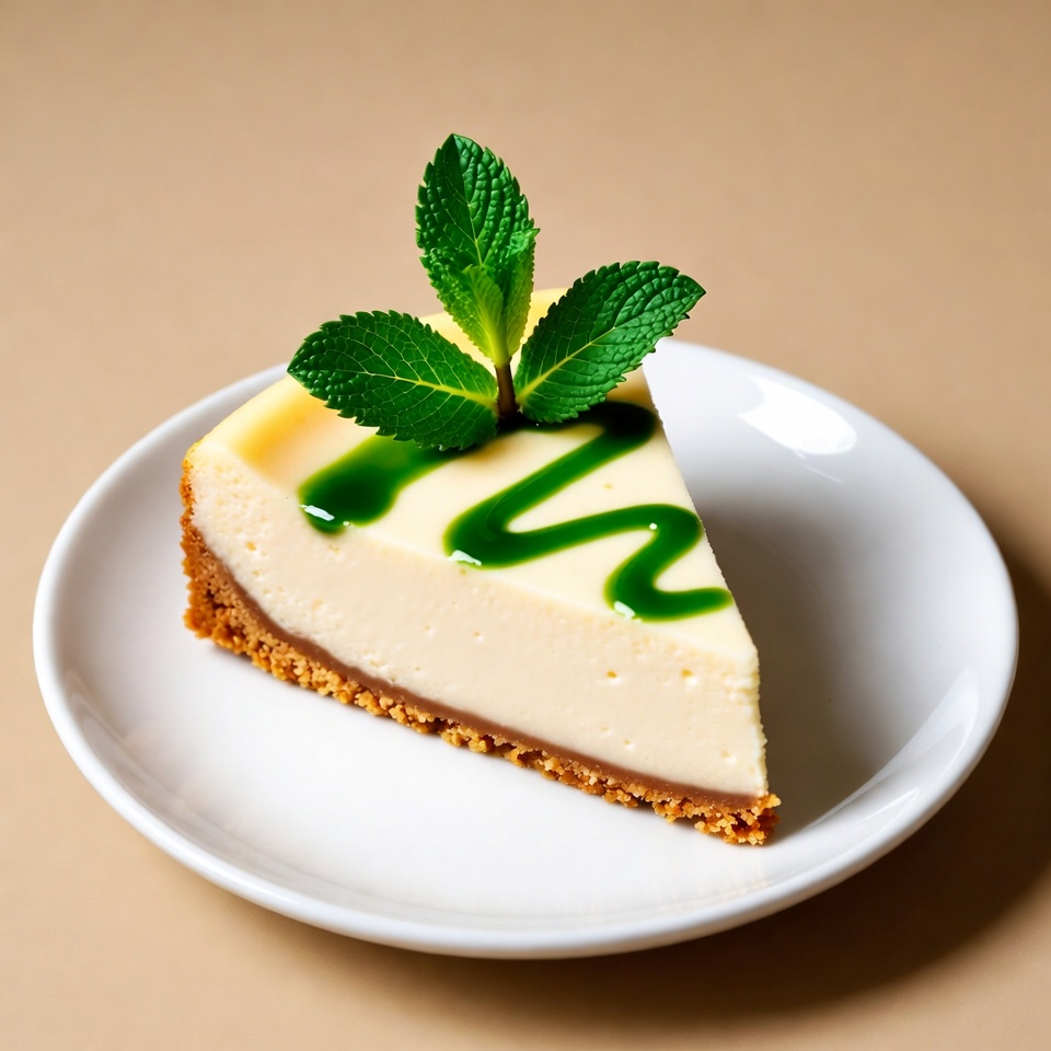 A slice of cheesecake is served on a white plate. The dessert features a green sauce on top and a garnish of fresh mint.