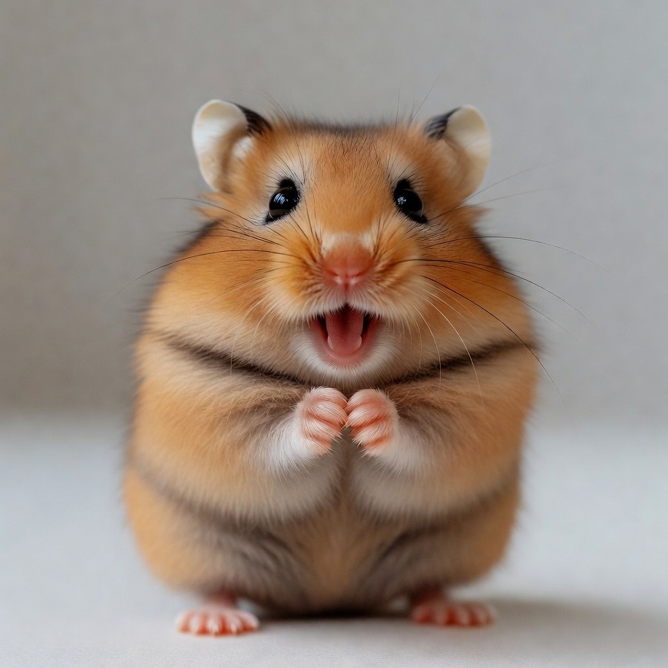 A small hamster stands with its front paws together and mouth open. It is set against a simple background, showcasing its round body and face.