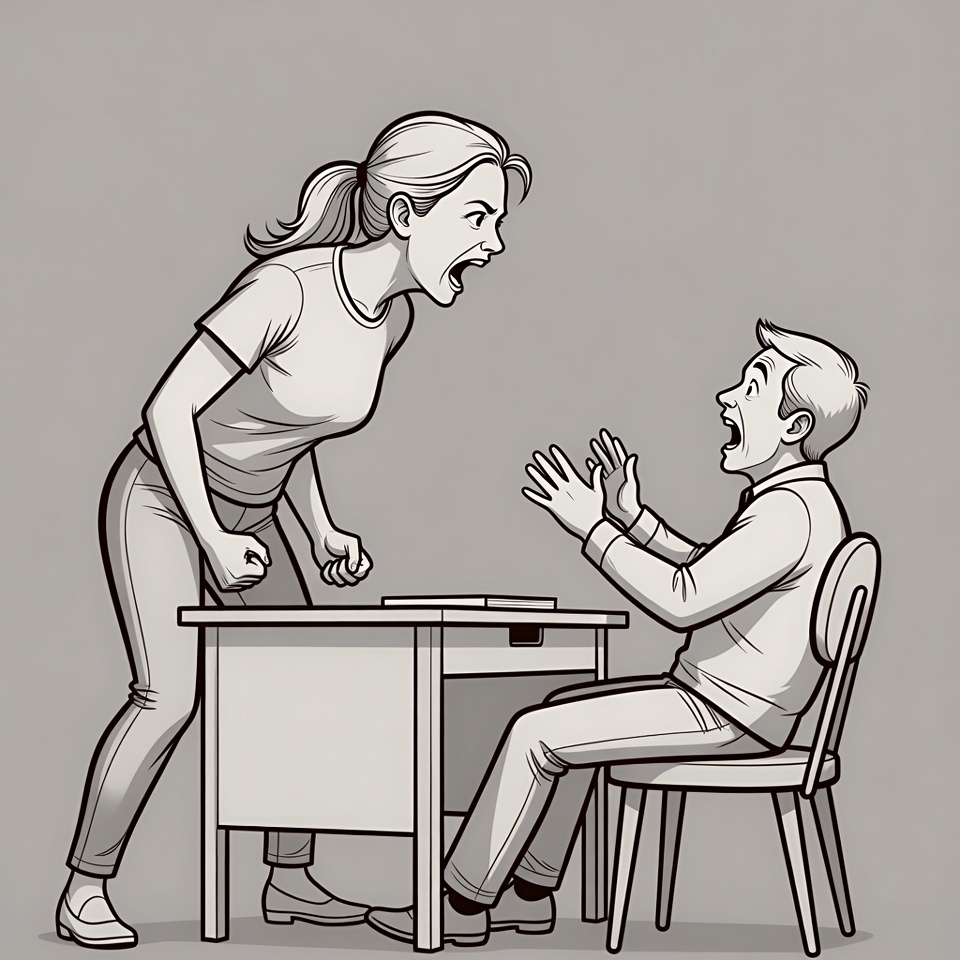 A parent is yelling at a child who is sitting at a desk. The child looks scared and tries to defend himself while being scolded.