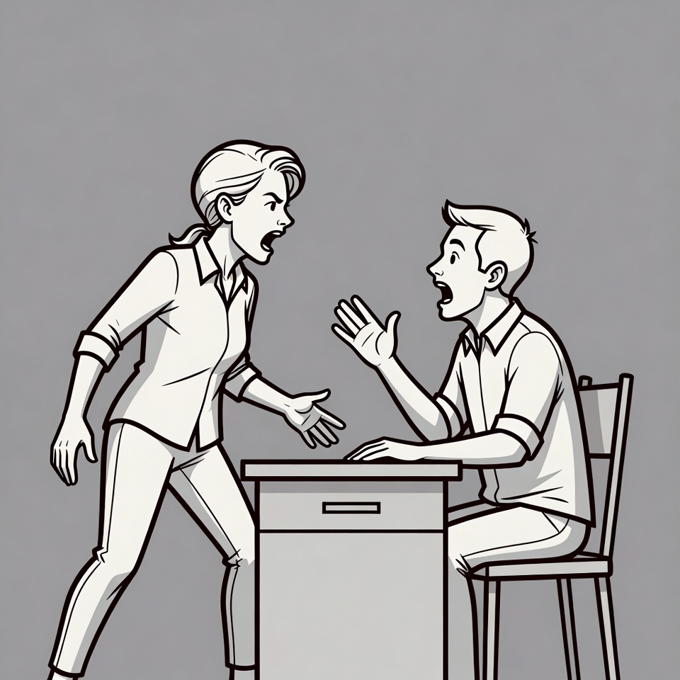 argument, communication, conflict, disagreement, discussion, emotions, expression, gestures, indoor, interaction, man, people, relationship, room, seated, small desk, standing, talking, tension, woman