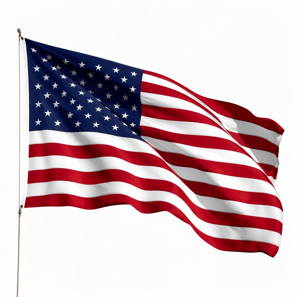 An American flag flies high, showing its stars and stripes as it flutters in the wind outdoors during daylight in a clear sky.