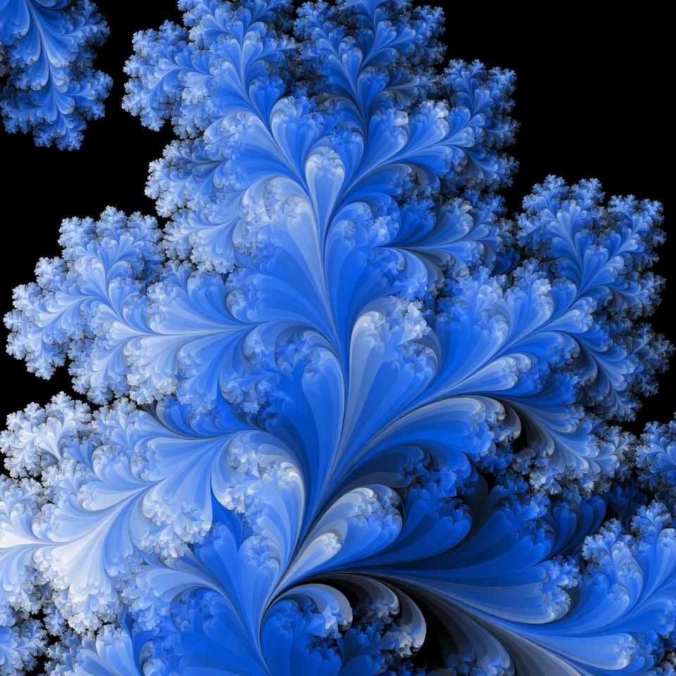 A complex blue fractal design forms a pattern against a black background, showcasing intricate shapes and curves.