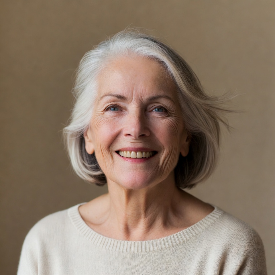 A senior woman smiles in a neutral room, wearing a light sweater. Her gray hair frames her face as she appears content and happy.