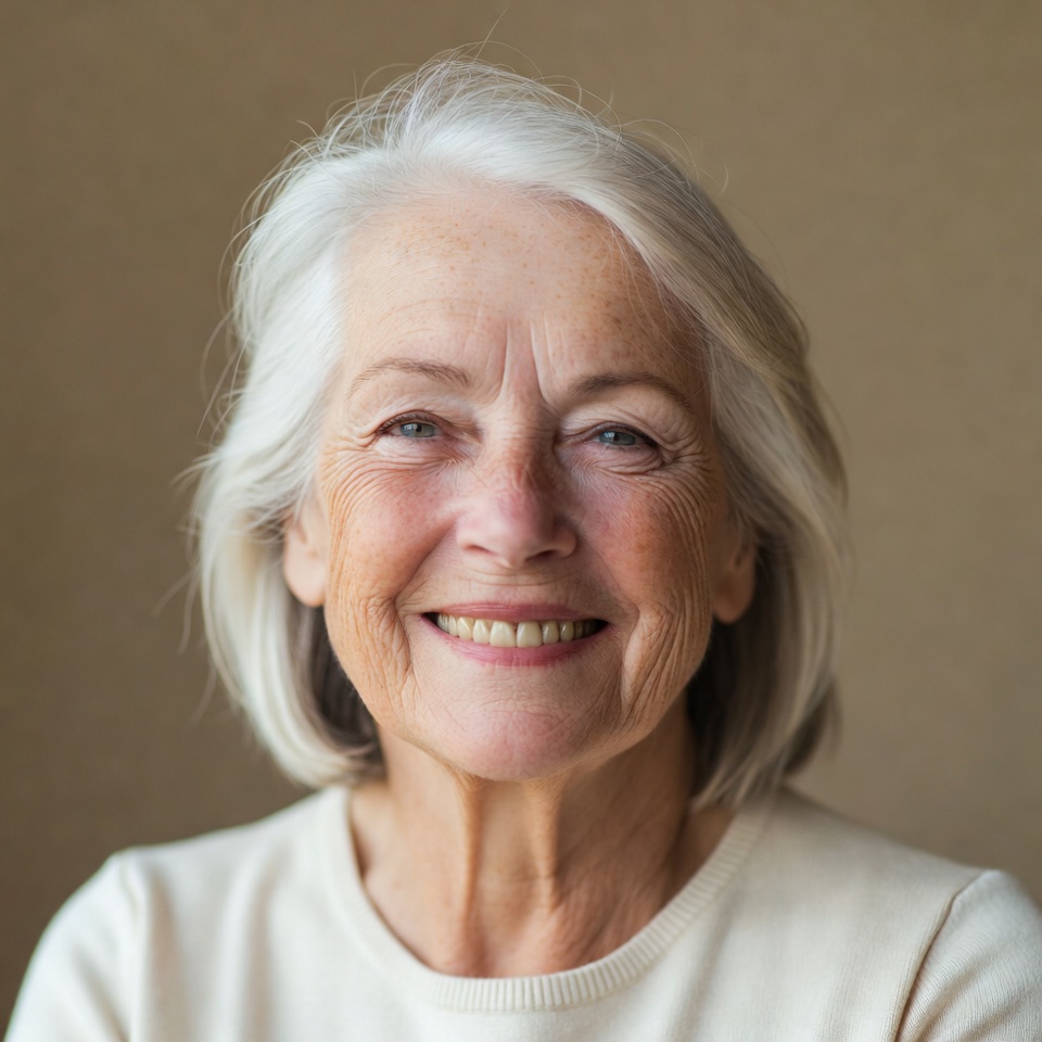 A woman with gray hair smiles at the camera. She is sitting indoors against a plain background. Her expression shows warmth and joy.