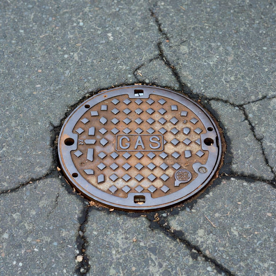 A gas manhole cover is placed in the road. Cracks are visible around the cover, showing wear and tear on the pavement.