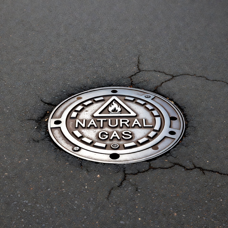 A metal cover labeled natural gas lies on a cracked asphalt street. The cover warns of the presence of natural gas below.