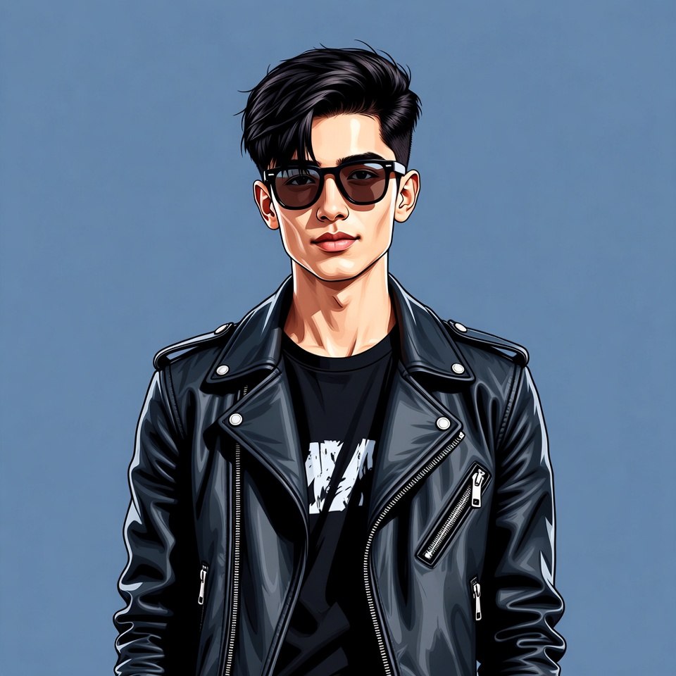 A young man stands with confidence, wearing sunglasses and a leather jacket. His expression is neutral against a solid blue background.