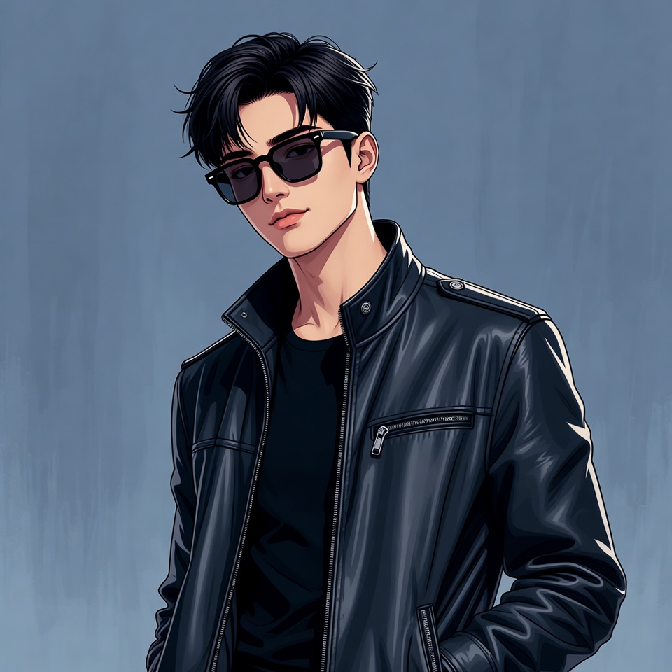 accessories, attitude, blue background, casual wear, confident pose, cool, expression, fashion, graphic art, hairstyle, leather jacket, men's clothing, modern, outfit, portrait, style, sunglasses, urban look, young man, youth culture