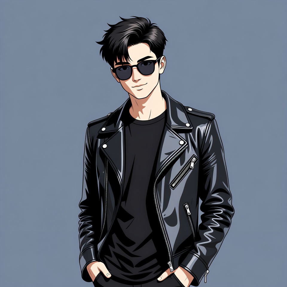 accessories, black outfit, casual style, character design, confident look, cool, fashion, illustration, leather jacket, male, modern, portrait, short hair, standing pose, stylish, sunglasses, trend, urban, young man, youth