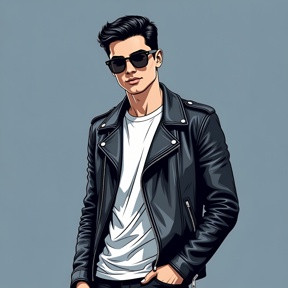 A young man stands confidently wearing a leather jacket and sunglasses against a plain background. He poses with a relaxed expression.