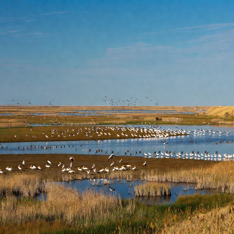 Birds gather in wetland areas with grass and water. The scenery shows many birds flying and resting under a clear blue sky.