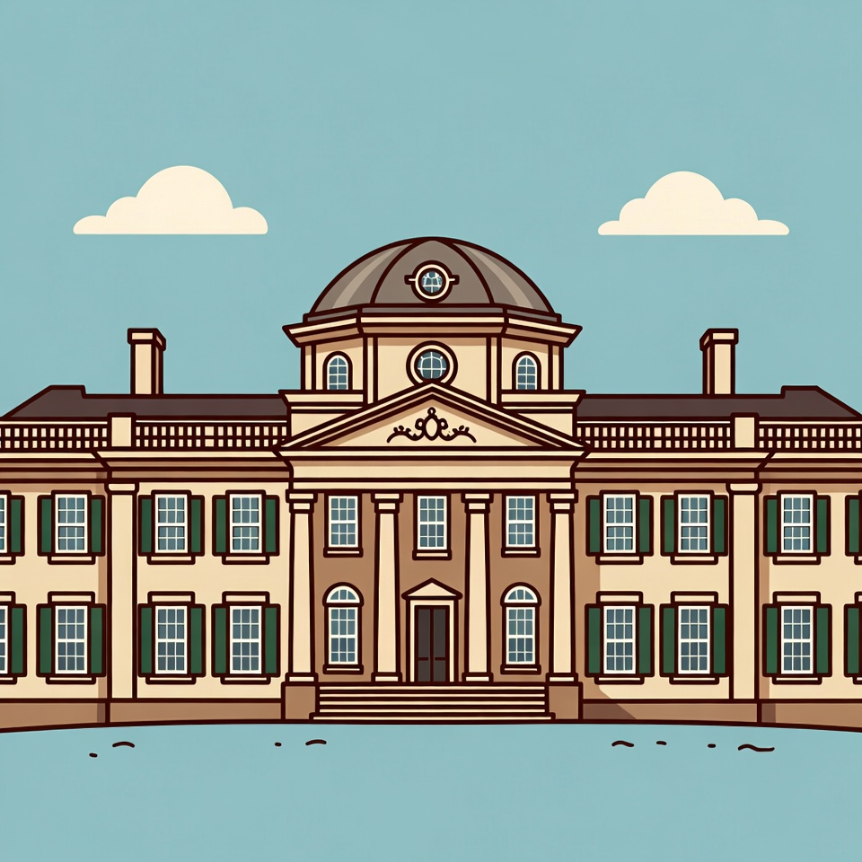 A large mansion with a dome and tall columns stands against a blue sky. Green windows and details add to the structure.