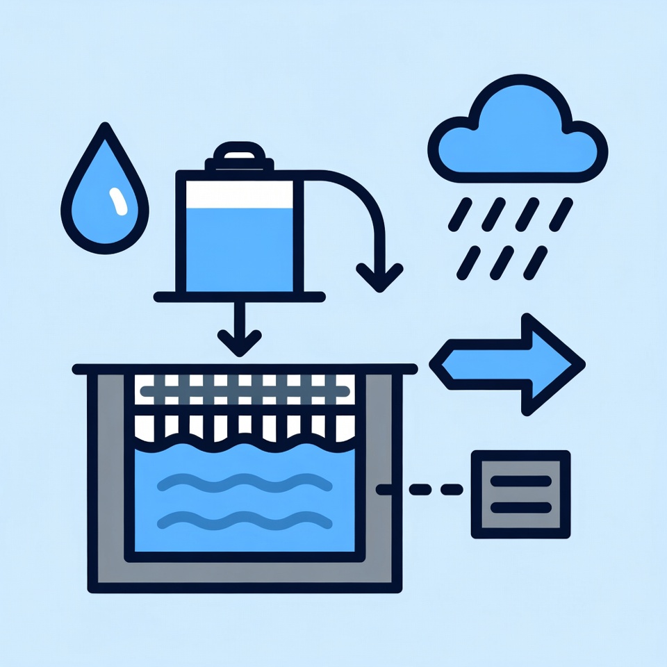 The process of water management, including collection, storage, and distribution. It features elements like rain, water, and a tank.