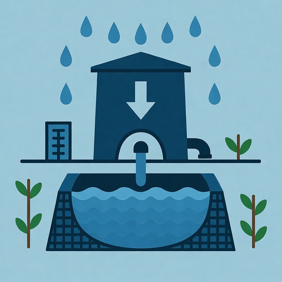 basin, collection, conservation, design, diagram, drainage, droplets, environment, flow, graphic, illustration, infrastructure, pipe, rain, resources, storage, system, tank, technology, water management