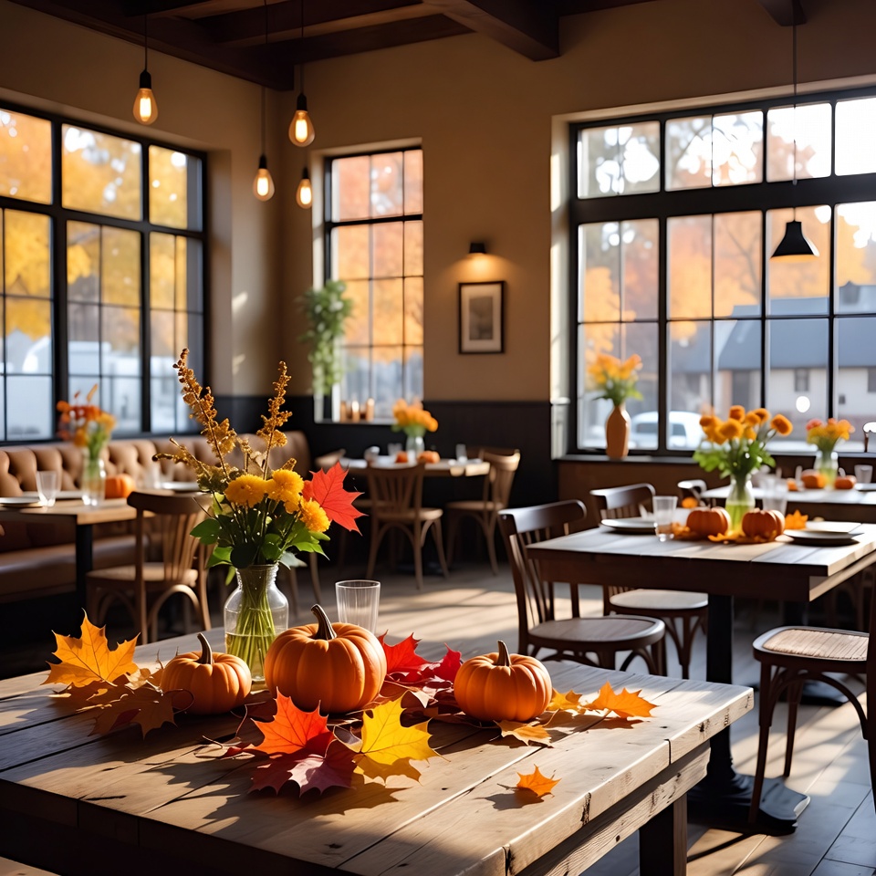 autumn, colors, cozy, decorations, dining, fall, flowers, food, harvest, indoors, leaves, orange, pumpkins, restaurant, seating, space, sunlight, tables, warm, windows