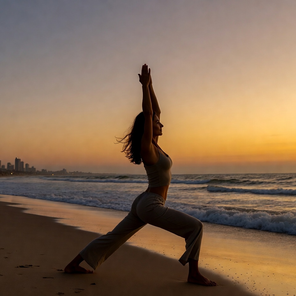 A person performs yoga on the beach during sunset. Waves crash softly as the sun sets, painting the sky with warm colors.