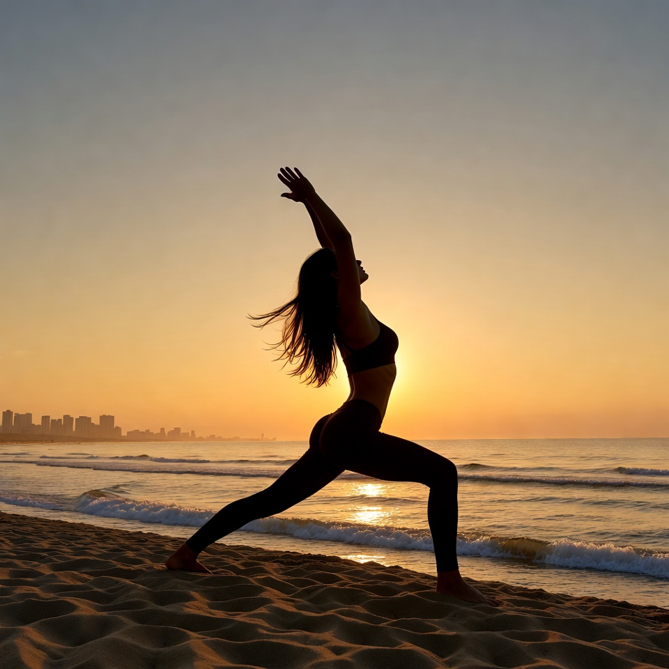 A person practices yoga on the sand during sunset. Waves crash in the background while the sun sets behind the city skyline.