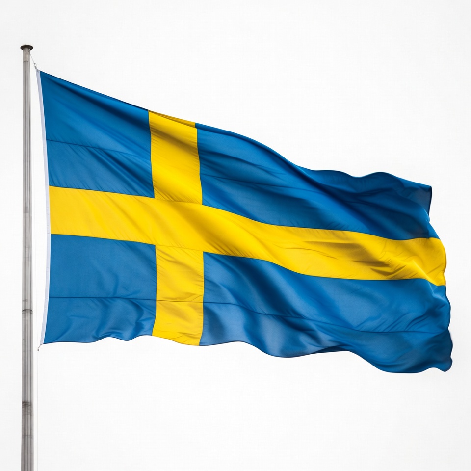 A blue and yellow Swedish flag is flying on a flagpole. The wind catches the fabric, making it flutter against a light background.
