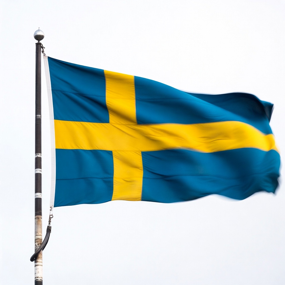 A blue and yellow flag of Sweden flutters on a flagpole under a cloudy sky. It showcases the colors prominently as it moves.