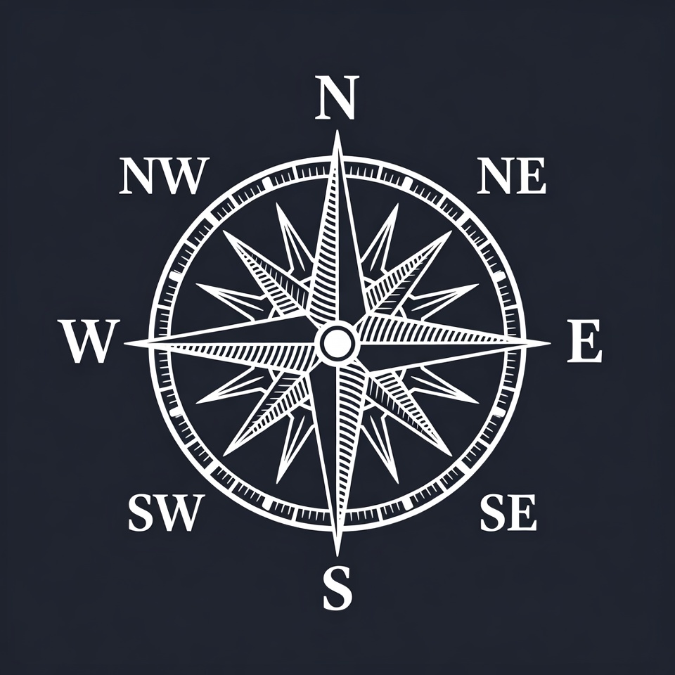 A compass design shows the cardinal directions. The points are clearly marked, and the background is dark. This design emphasizes navigation.