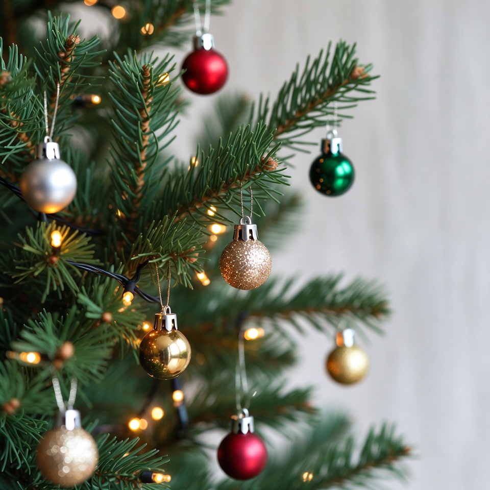A Christmas tree is decorated with bright ornaments. The tree has green needles and lights glowing softly.