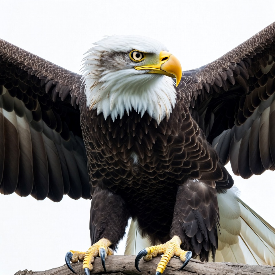 An eagle stands on a branch with wings spread wide. Its sharp eyes look forward. The background is light and clear.