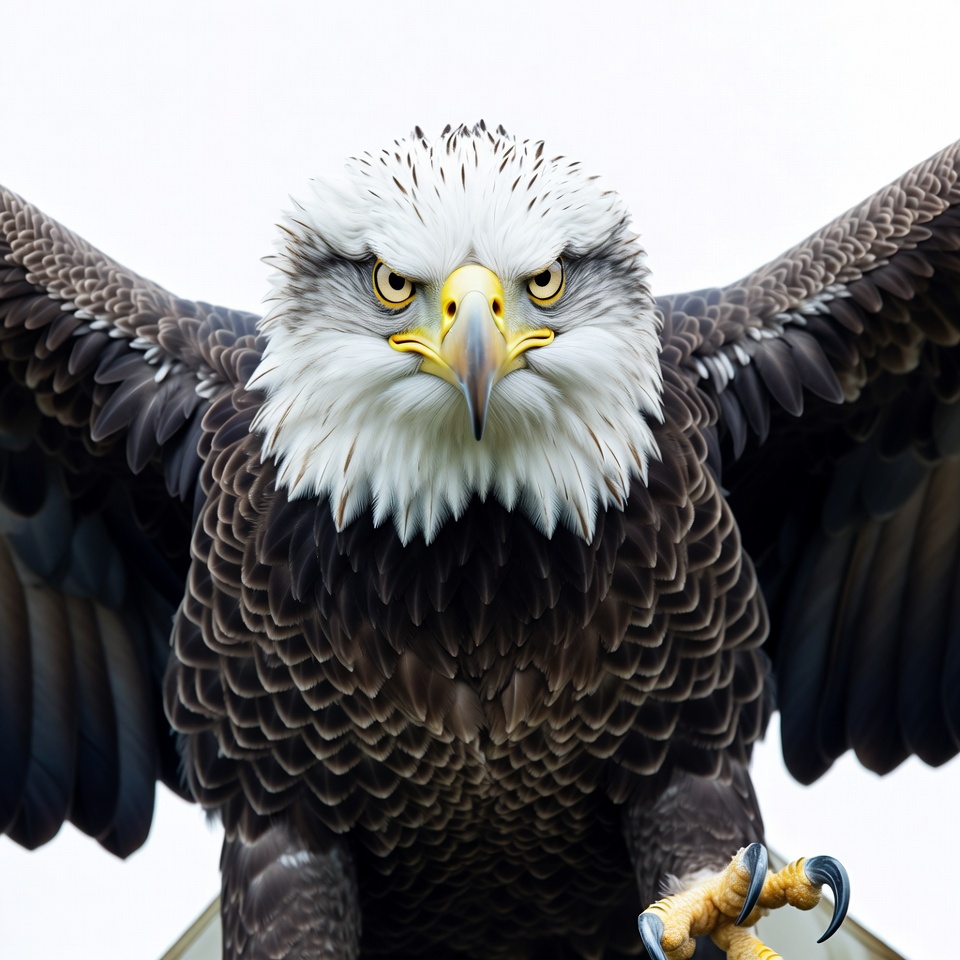 Eagle displays powerful wings while perched. Its fierce gaze captures attention against a light background.