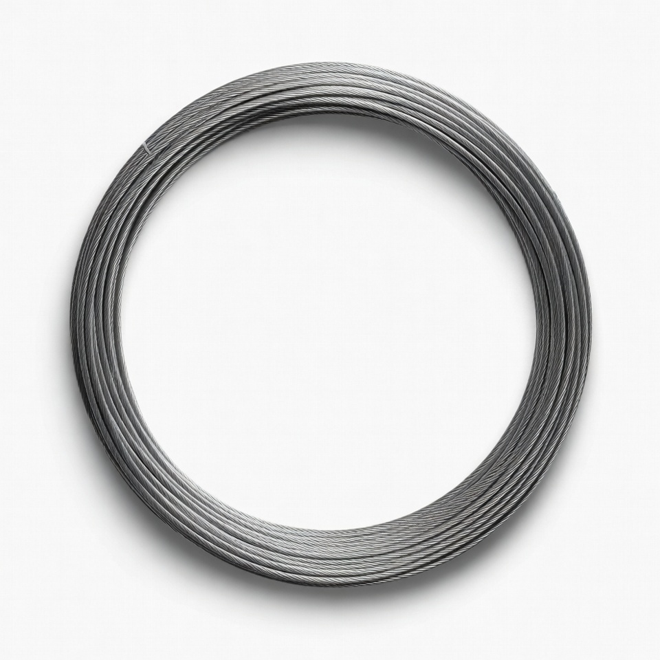 A spool of metal wire is placed on a flat surface. The wire is neatly wound in a circular form.
