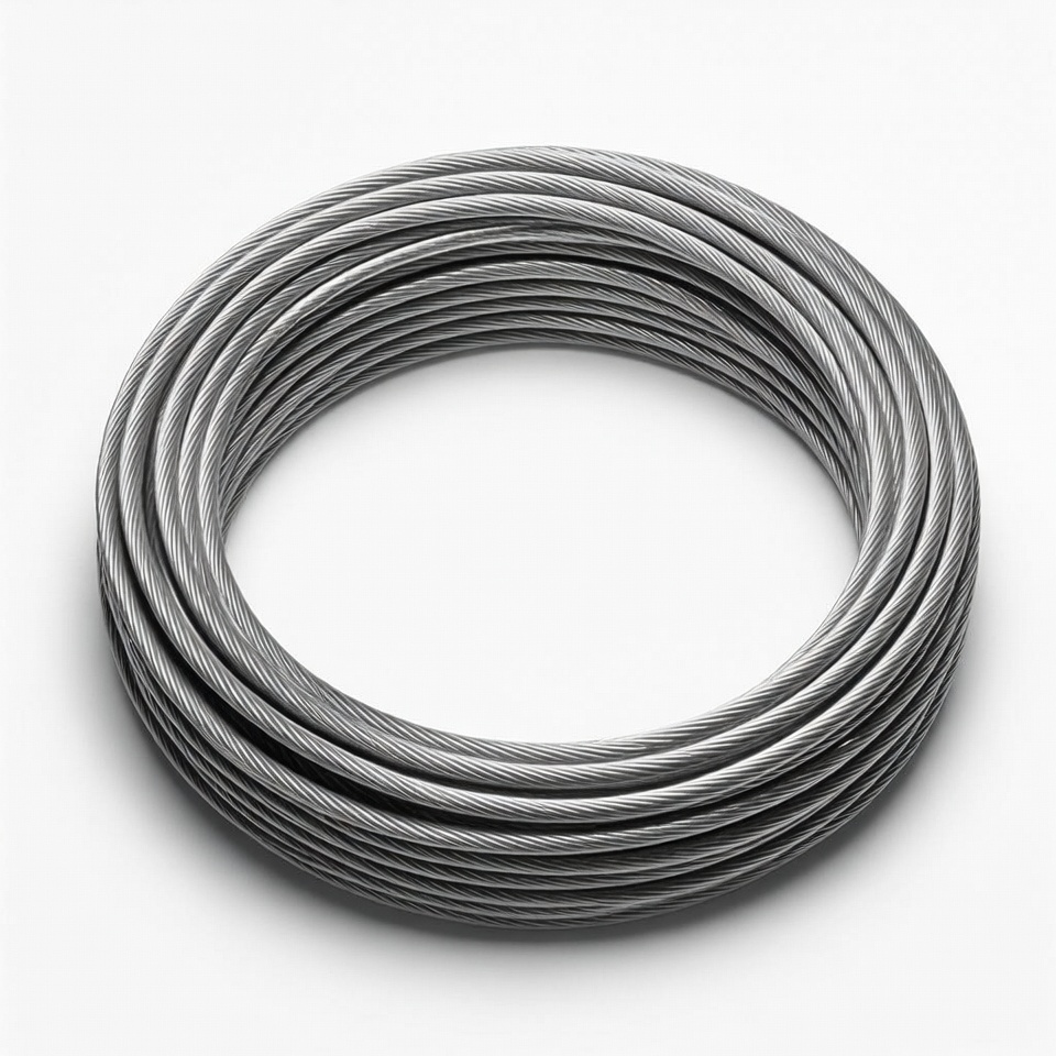 This shows a coil of steel wire resting on a plain white surface. The wire is neatly arranged in a circular shape for easy use.