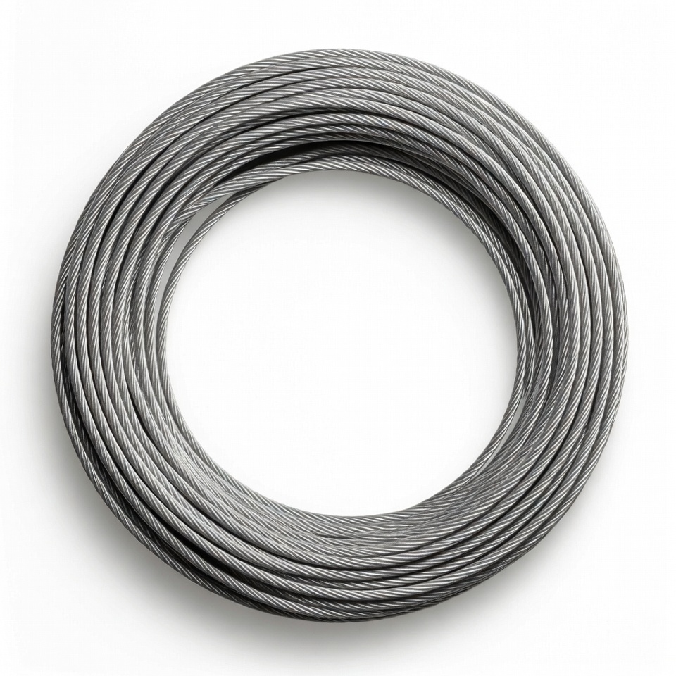 A round coil of steel wire sits on a plain white background. The wire is tightly wound and has a smooth finish, showing its metallic texture.