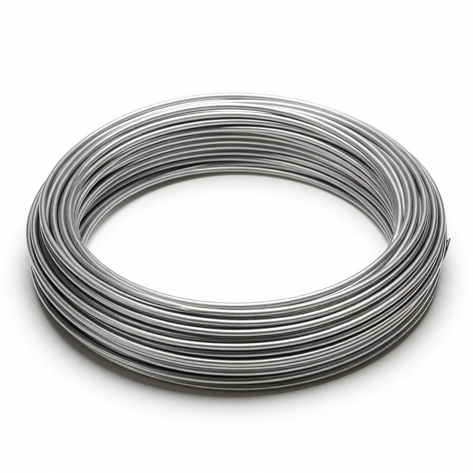 A coil of metal wire placed on a plain background. The wire is neatly coiled and ready for various uses or projects.