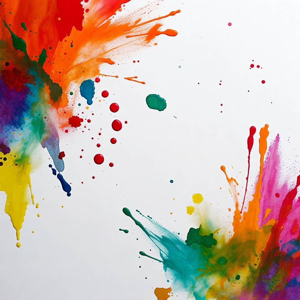 Bright colors mix and splash on a white surface. The scene shows an energetic display of paint in various directions.
