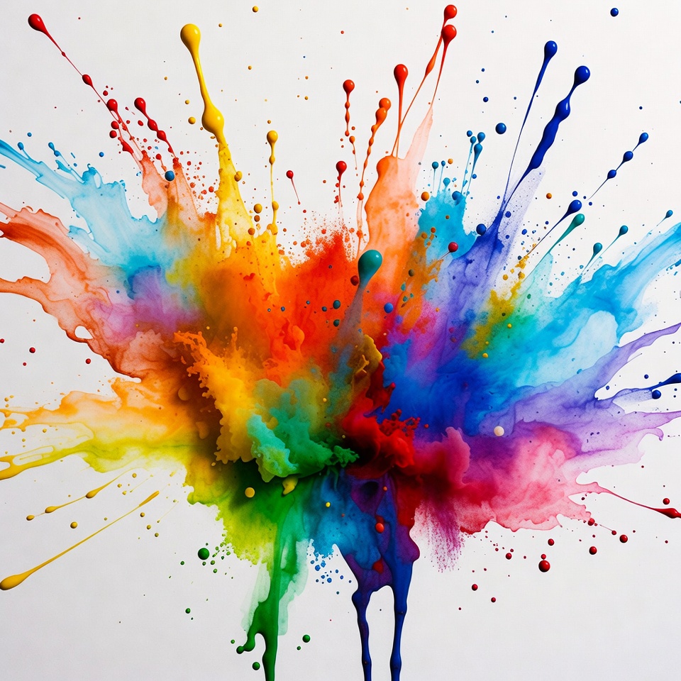Bright paint splatters cover a canvas, showing various colors mixing and bursting in a creative display of art and expression.