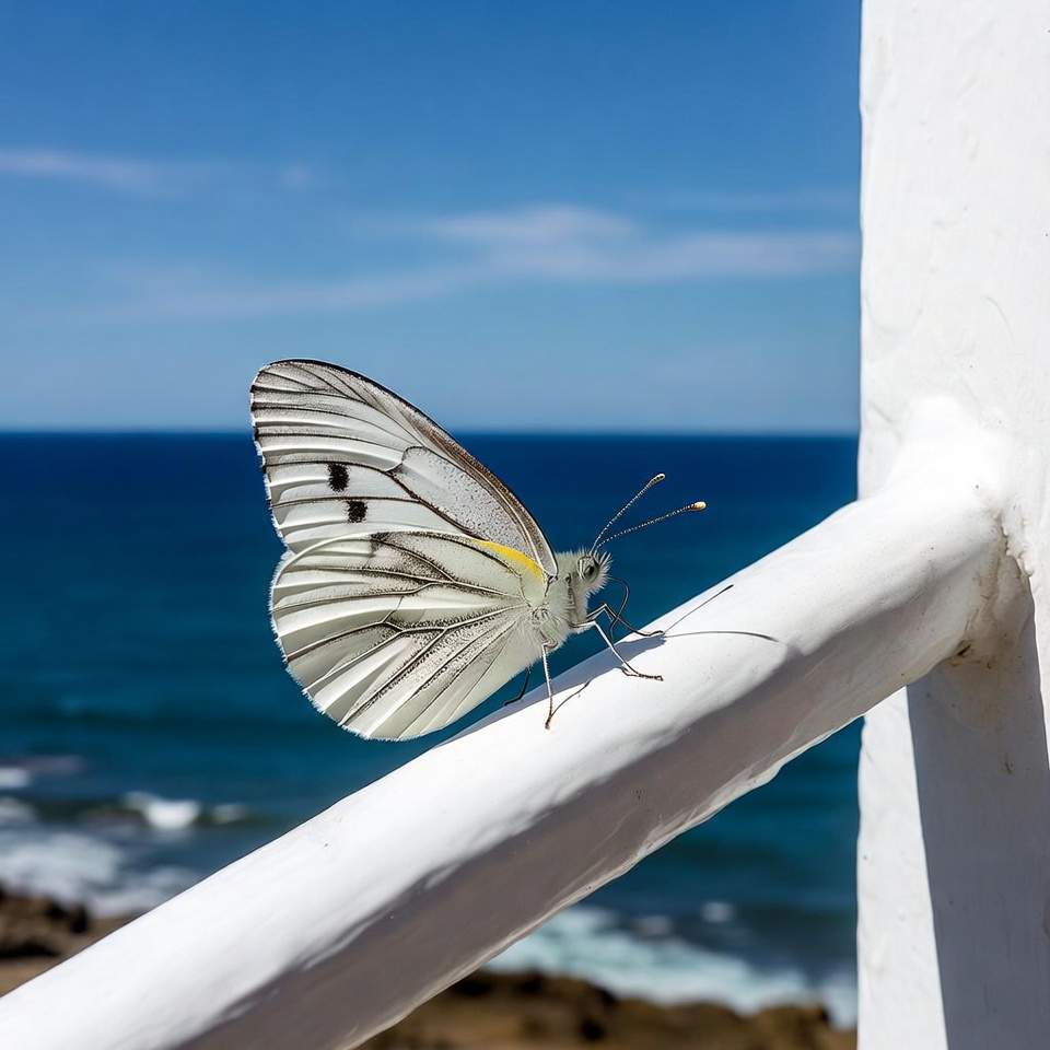 beauty, blue sky, butterfly, calm, close-up, coast, color, delicate, environment, flight, freedom, insect, nature, ocean, outdoor, railing, relaxing, sea, summer, wildlife