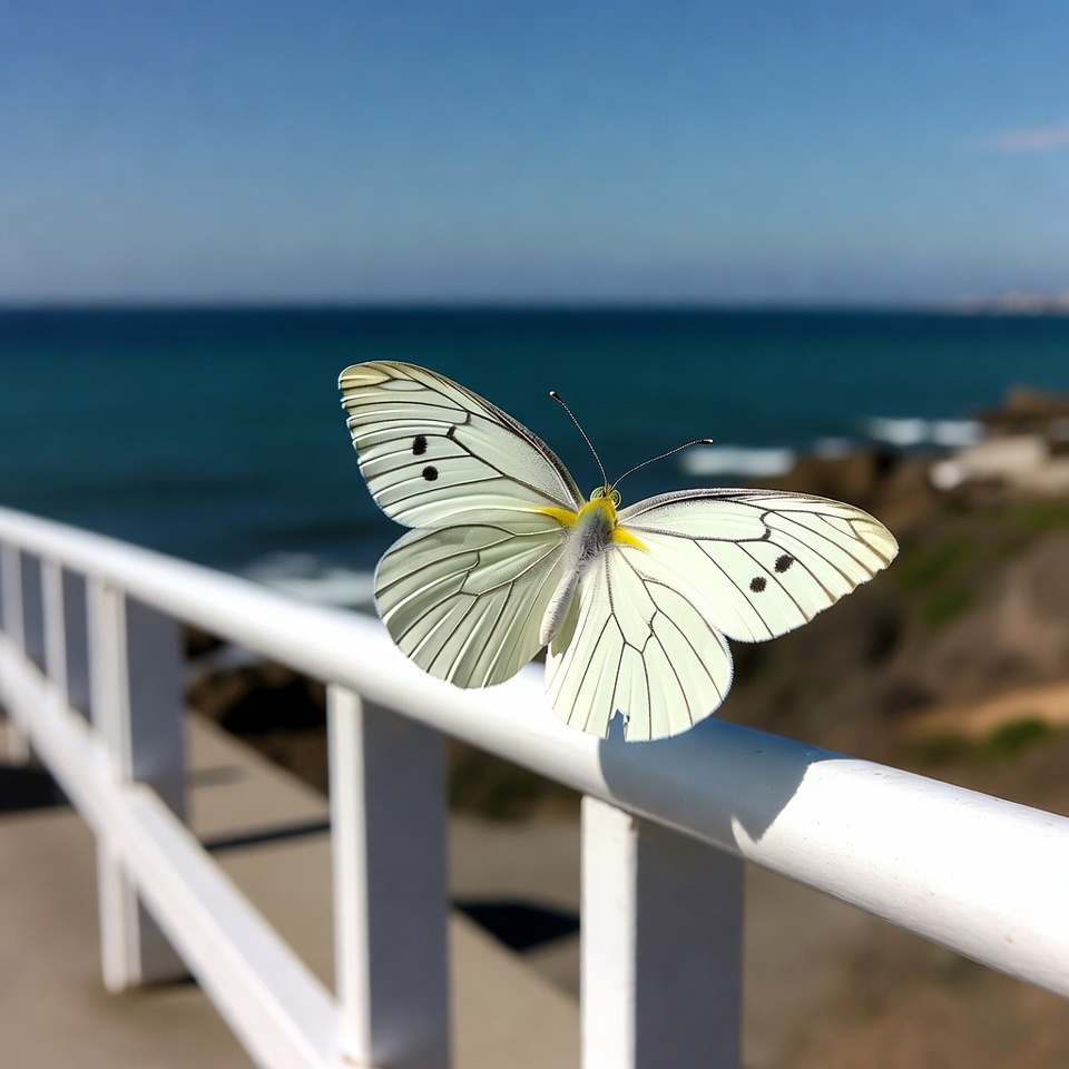 A butterfly rests on a railing near the ocean. The blue water and clear sky create a bright backdrop for this moment.