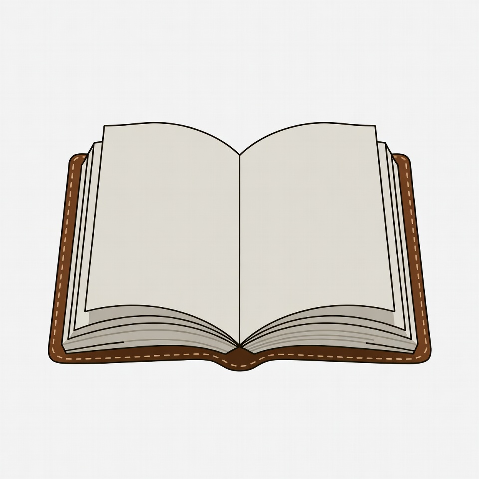 An open book rests on a surface, displaying blank pages ready for writing or drawing. It invites creativity and imagination.