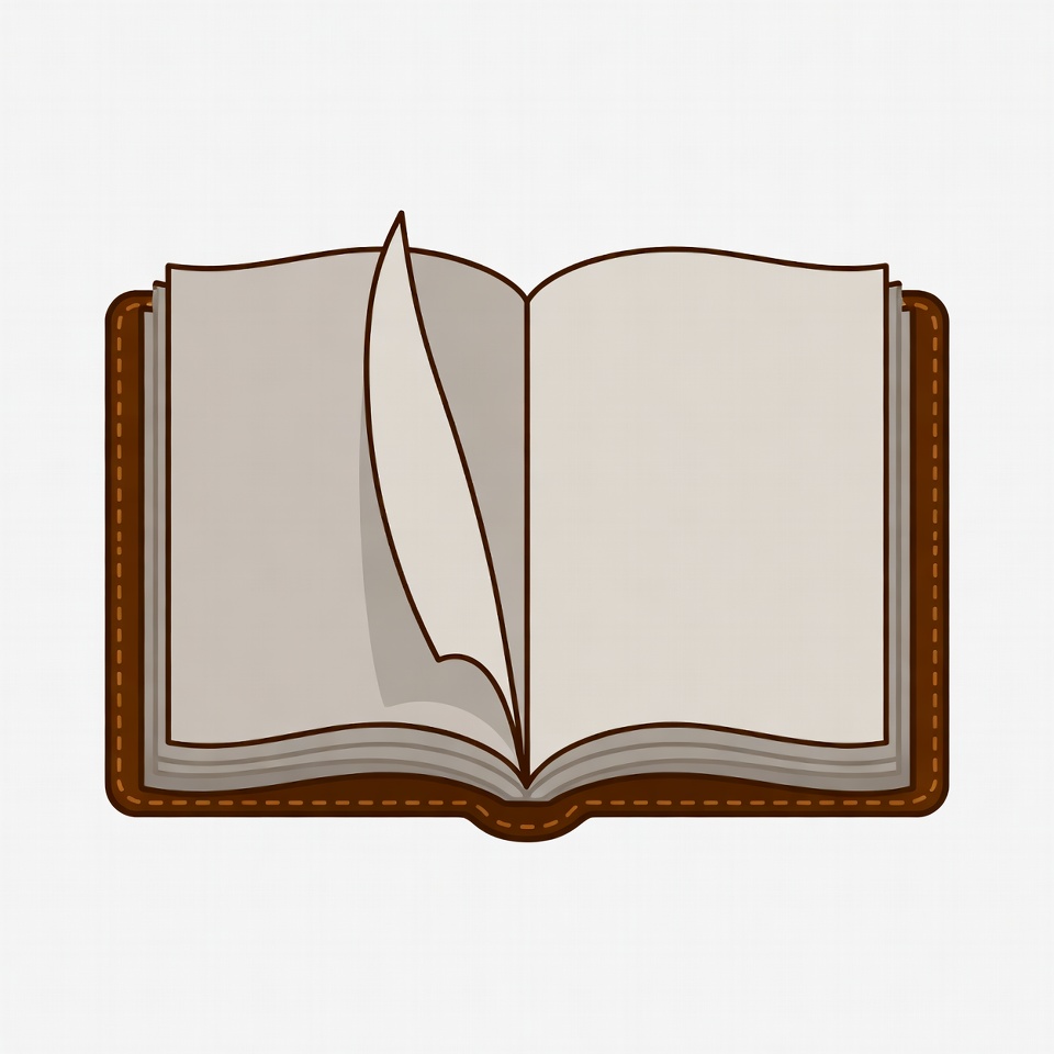 An open book with pages waiting to be filled. It shows an empty space for writing or drawing. The cover is brown with stitching.