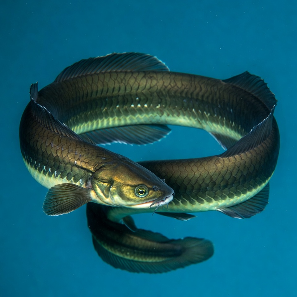 A fish swims in clear water, creating ripples as it moves. The setting is underwater, showcasing the fish's body and reflection.